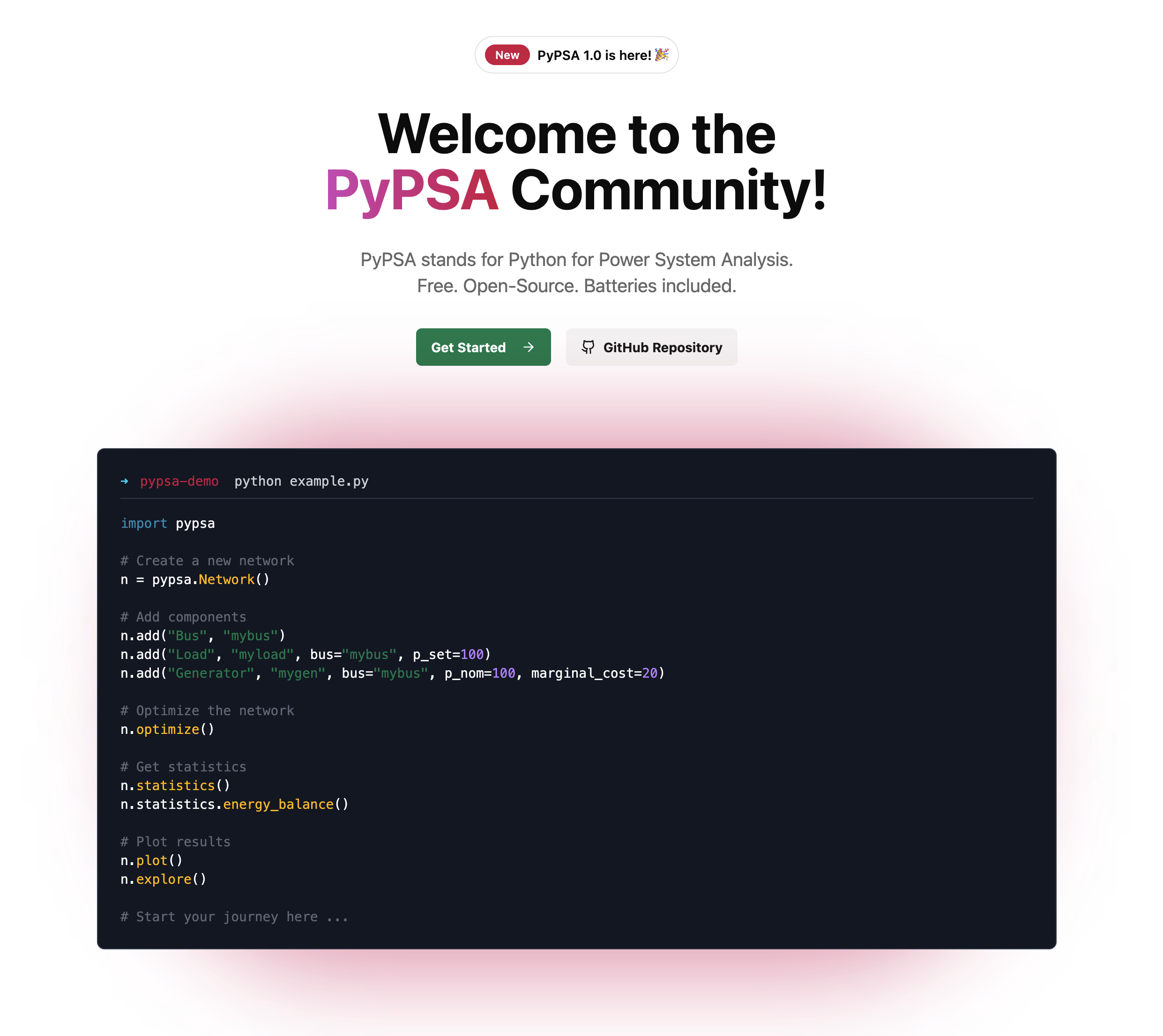 After contributions from 200+ people across ~1400 issues in ~5000 commits, weβre excited to announce PyPSA v1.0! This milestone release brings major new features, completely new documentation, and a fresh landing page.